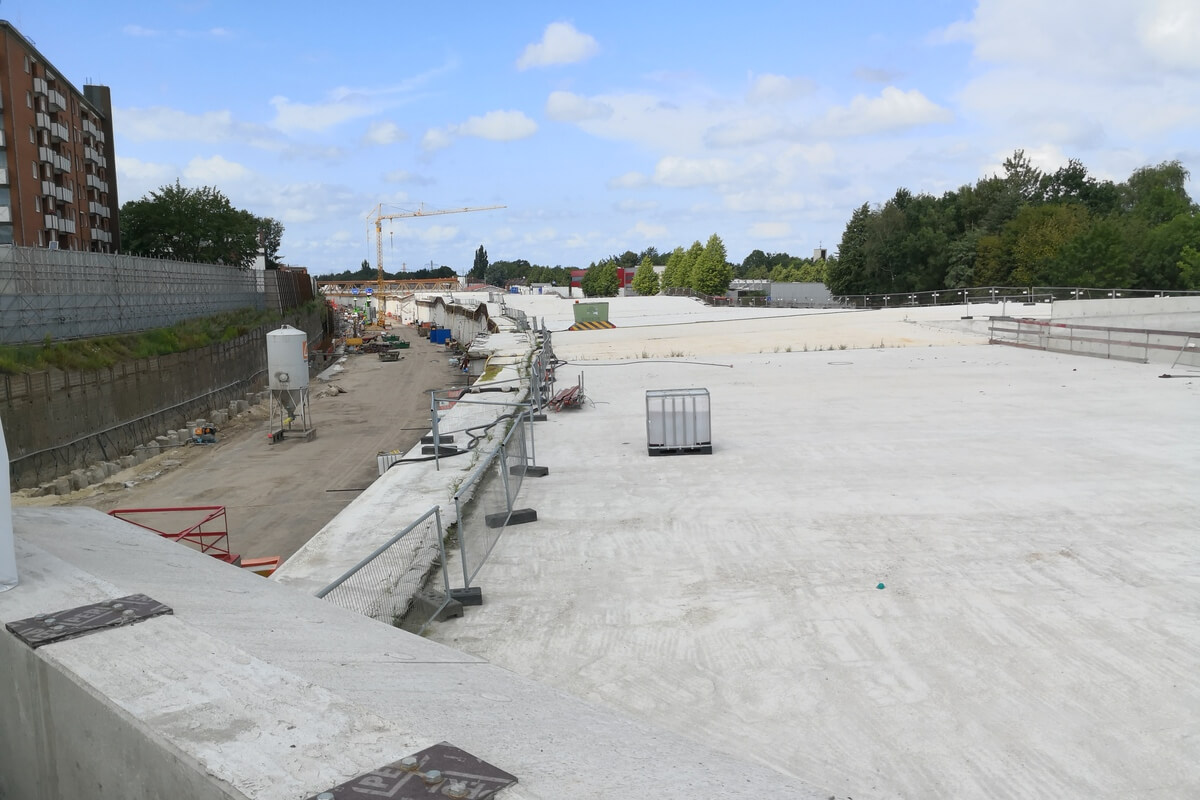 ปูแผ่นกั้นความชื้น (moisture barrier) เช่น แผ่นพลาสติกโพลีเอทิลีน ในจุดที่กำหนด เพื่อป้องกันการถ่ายเทของไอน้ำจากดินเข้าสู่คอนกรีต
